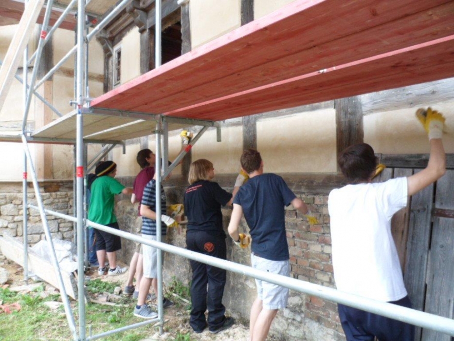 Die Jugendlichen erlernten die Instandsetzung historischer Gefache aus dem 16. Jahrhundert sowie das Ausstopfen der Stakenhölzer mit Strohlehmputz der Südfassade.